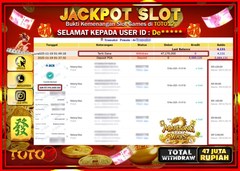 Selamat kepada Member Kami De****** Telah Jackpot dan berhasil mendapatkan kemenangan besar pada permainan JACKPOT SLOT GAME (MAHJONG WAYS) Dengan Kemenangan Sebesar Rp.47.170.000 –. Setelah mengisi Fomulir Withdraw dengan Kurang waktu 1-2 Menit Dana sudah kami Trasnfer kepada Pemilik Userid dan dana sudah dapat di cairkan oleh pemenang. Bukti Pembayaran yang TOTO12 berikan merupakan Bukti Pembayaran…