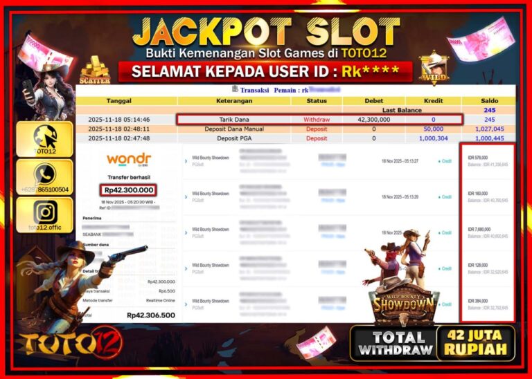 Selamat kepada Member Kami Rk****** Telah Jackpot dan berhasil mendapatkan kemenangan besar pada permainan JACKPOT SLOT GAME (WILD BOUNTY SHOWDOWN) Dengan Kemenangan Sebesar Rp.42.300.000 –. Setelah mengisi Fomulir Withdraw dengan Kurang waktu 1-2 Menit Dana sudah kami Trasnfer kepada Pemilik Userid dan dana sudah dapat di cairkan oleh pemenang. Bukti Pembayaran yang TOTO12 berikan merupakan Bukti…