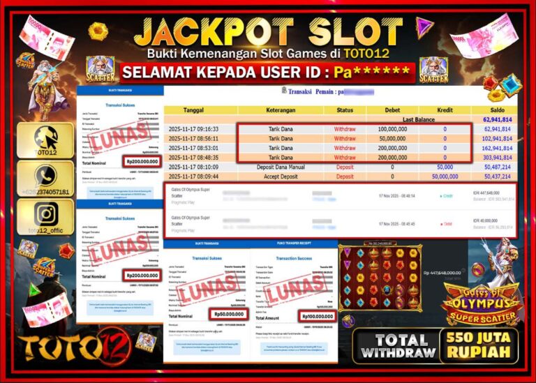 Selamat kepada Member Kami Pa****** Telah Jackpot dan berhasil mendapatkan kemenangan besar pada permainan JACKPOT SLOT GAME (GATES OF OLYMPUS SUPER SCATTER) Dengan Kemenangan Sebesar Rp.550.000.000 –. Setelah mengisi Fomulir Withdraw dengan Kurang waktu 1-2 Menit Dana sudah kami Trasnfer kepada Pemilik Userid dan dana sudah dapat di cairkan oleh pemenang. Bukti Pembayaran yang TOTO12 berikan…
