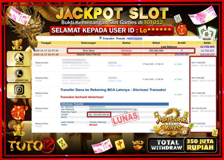 Selamat kepada Member Kami Lo****** Telah Jackpot dan berhasil mendapatkan kemenangan besar pada permainan JACKPOT SLOT GAME (MAHJONG WAYS) Dengan Kemenangan Sebesar Rp.350.000.000 –. Setelah mengisi Fomulir Withdraw dengan Kurang waktu 1-2 Menit Dana sudah kami Trasnfer kepada Pemilik Userid dan dana sudah dapat di cairkan oleh pemenang. Bukti Pembayaran yang TOTO12 berikan merupakan Bukti Pembayaran…