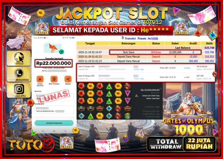 Selamat kepada Member Kami He****** Telah Jackpot dan berhasil mendapatkan kemenangan besar pada permainan JACKPOT SLOT GAME (GATES OF OLYMPUS 1000) Dengan Kemenangan Sebesar Rp.22.000.000 –. Setelah mengisi Fomulir Withdraw dengan Kurang waktu 1-2 Menit Dana sudah kami Trasnfer kepada Pemilik Userid dan dana sudah dapat di cairkan oleh pemenang. Bukti Pembayaran yang TOTO12 berikan merupakan…