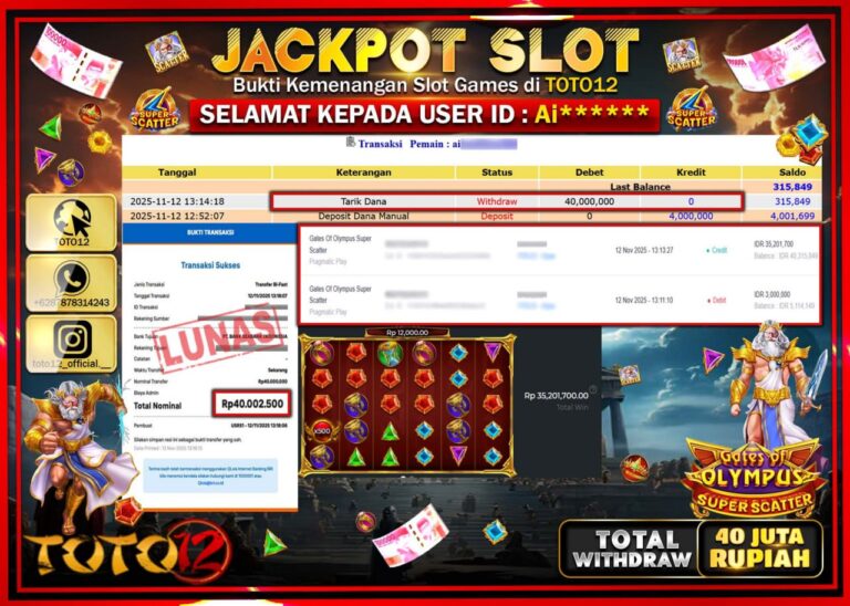 Selamat kepada Member Kami Ai****** Telah Jackpot dan berhasil mendapatkan kemenangan besar pada permainan JACKPOT SLOT GAME (GATES OF OLYMPUS SUPER SCATTER) Dengan Kemenangan Sebesar Rp.40.000.000 –. Setelah mengisi Fomulir Withdraw dengan Kurang waktu 1-2 Menit Dana sudah kami Trasnfer kepada Pemilik Userid dan dana sudah dapat di cairkan oleh pemenang. Bukti Pembayaran yang TOTO12 berikan…