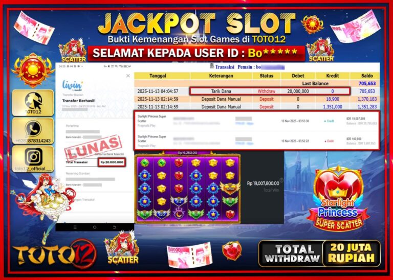 Selamat kepada Member Kami Bo****** Telah Jackpot dan berhasil mendapatkan kemenangan besar pada permainan JACKPOT SLOT GAME (STARLIGHT PRINCESS SUPER SCATTER) Dengan Kemenangan Sebesar Rp.20.000.000 –. Setelah mengisi Fomulir Withdraw dengan Kurang waktu 1-2 Menit Dana sudah kami Trasnfer kepada Pemilik Userid dan dana sudah dapat di cairkan oleh pemenang. Bukti Pembayaran yang TOTO12 berikan merupakan…