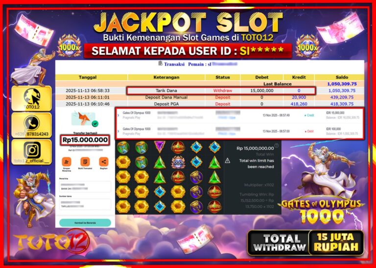 Selamat kepada Member Kami As****** Telah Jackpot dan berhasil mendapatkan kemenangan besar pada permainan JACKPOT SLOT GAME (GATES OF OLYMPUS SUPER SCATTER) Dengan Kemenangan Sebesar Rp.15.000.000 –. Setelah mengisi Fomulir Withdraw dengan Kurang waktu 1-2 Menit Dana sudah kami Trasnfer kepada Pemilik Userid dan dana sudah dapat di cairkan oleh pemenang. Bukti Pembayaran yang TOTO12 berikan…
