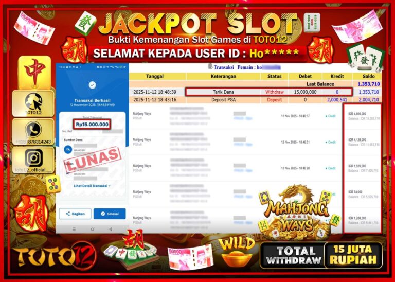 Selamat kepada Member Kami Te****** Telah Jackpot dan berhasil mendapatkan kemenangan besar pada permainan JACKPOT SLOT GAME (MAHJONG WAYS) Dengan Kemenangan Sebesar Rp.15.000.000 –. Setelah mengisi Fomulir Withdraw dengan Kurang waktu 1-2 Menit Dana sudah kami Trasnfer kepada Pemilik Userid dan dana sudah dapat di cairkan oleh pemenang. Bukti Pembayaran yang TOTO12 berikan merupakan Bukti Pembayaran…