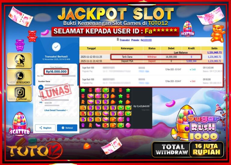 Selamat kepada Member Kami Fa****** Telah Jackpot dan berhasil mendapatkan kemenangan besar pada permainan JACKPOT SLOT GAME (SUGAR RUSH 1000) Dengan Kemenangan Sebesar Rp.16.000.000 –. Setelah mengisi Fomulir Withdraw dengan Kurang waktu 1-2 Menit Dana sudah kami Trasnfer kepada Pemilik Userid dan dana sudah dapat di cairkan oleh pemenang. Bukti Pembayaran yang TOTO12 berikan merupakan Bukti…