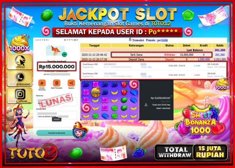 Selamat kepada Member Kami Po****** Telah Jackpot dan berhasil mendapatkan kemenangan besar pada permainan JACKPOT SLOT GAME (SWEET BONANZA 1000) Dengan Kemenangan Sebesar Rp.15.000.000 –. Setelah mengisi Fomulir Withdraw dengan Kurang waktu 1-2 Menit Dana sudah kami Trasnfer kepada Pemilik Userid dan dana sudah dapat di cairkan oleh pemenang. Bukti Pembayaran yang TOTO12 berikan merupakan Bukti…
