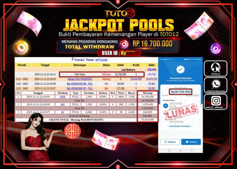 Selamat kepada Member Kami Uy****** Telah Jackpot dan berhasil mendapatkan kemenangan besar pada permainan JACKPOT POOLS PASARAN (HONGKONG) Dengan Kemenangan Sebesar Rp.16.700.000 –. Setelah mengisi Fomulir Withdraw dengan Kurang waktu 1-2 Menit Dana sudah kami Trasnfer kepada Pemilik Userid dan dana sudah dapat di cairkan oleh pemenang. Bukti Pembayaran yang TOTO12 berikan merupakan Bukti Pembayaran yang …