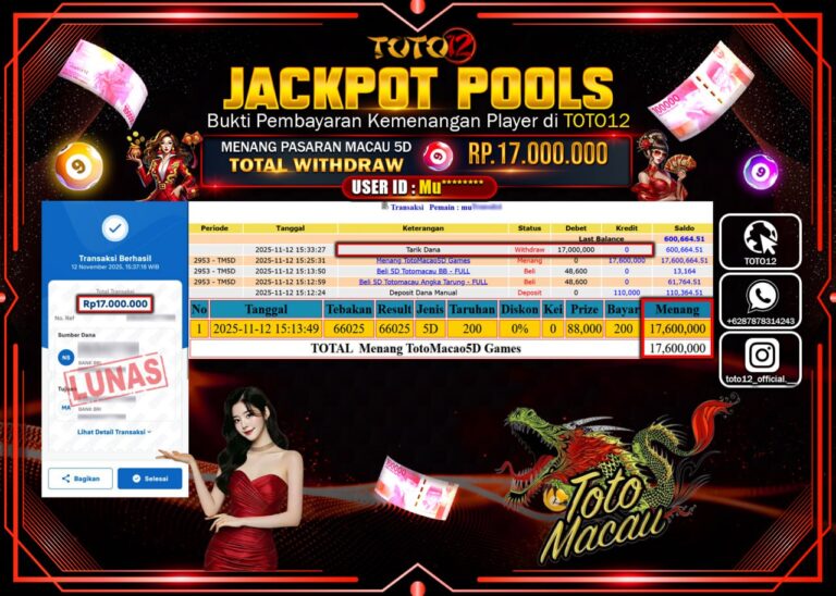 Selamat kepada Member Kami Mu****** Telah Jackpot dan berhasil mendapatkan kemenangan besar pada permainan JACKPOT POOLS PASARAN (MACAU 5D) Dengan Kemenangan Sebesar Rp.17.000.000 –. Setelah mengisi Fomulir Withdraw dengan Kurang waktu 1-2 Menit Dana sudah kami Trasnfer kepada Pemilik Userid dan dana sudah dapat di cairkan oleh pemenang. Bukti Pembayaran yang TOTO12 berikan merupakan Bukti Pembayaran…