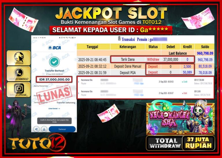 Selamat kepada Member Kami Ga****** Telah Jackpot dan berhasil mendapatkan kemenangan besar pada permainan JACKPOT SLOT GAME (NECROMANCER SHA) Dengan Kemenangan Sebesar Rp.37.000.000 –. Setelah mengisi Fomulir Withdraw dengan Kurang waktu 1-2 Menit Dana sudah kami Trasnfer kepada Pemilik Userid dan dana sudah dapat di cairkan oleh pemenang. Bukti Pembayaran yang TOTO12 berikan merupakan Bukti Pembayaran…