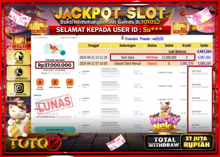 Selamat kepada Member Kami Su****** Telah Jackpot dan berhasil mendapatkan kemenangan besar pada permainan JACKPOT SLOT GAME (LUCKY NEKO) Dengan Kemenangan Sebesar Rp.37.000.000 –. Setelah mengisi Fomulir Withdraw dengan Kurang waktu 1-2 Menit Dana sudah kami Trasnfer kepada Pemilik Userid dan dana sudah dapat di cairkan oleh pemenang. Bukti Pembayaran yang TOTO12 berikan merupakan Bukti Pembayaran…