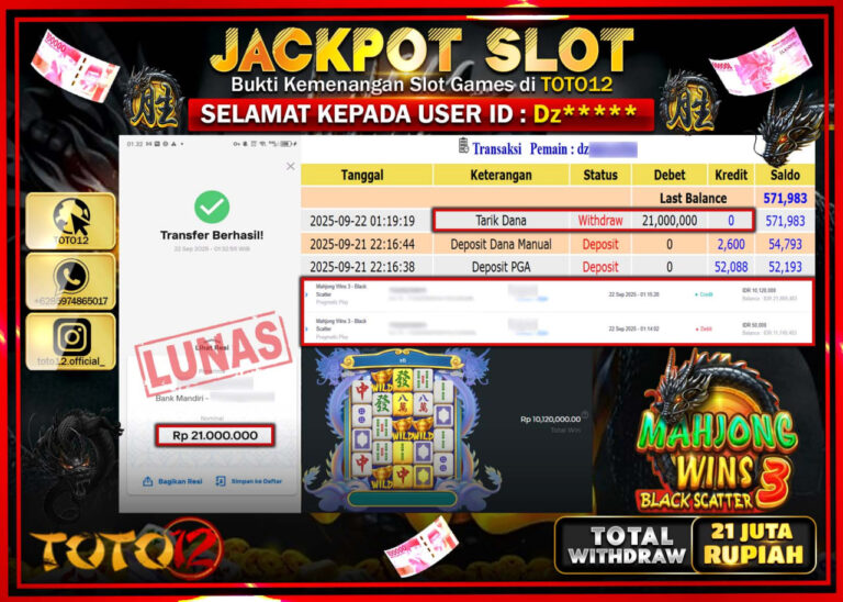 Selamat kepada Member Kami Dz**** Telah Jackpot dan berhasil mendapatkan kemenangan besar pada permainan JACKPOT SLOT GAME (MAHJONG WINS 3 BLACK SCATTER) Dengan Kemenangan Sebesar Rp.21.000.000 –. Setelah mengisi Fomulir Withdraw dengan Kurang waktu 1-2 Menit Dana sudah kami Trasnfer kepada Pemilik Userid dan dana sudah dapat di cairkan oleh pemenang. Bukti Pembayaran yang TOTO12 berikan…