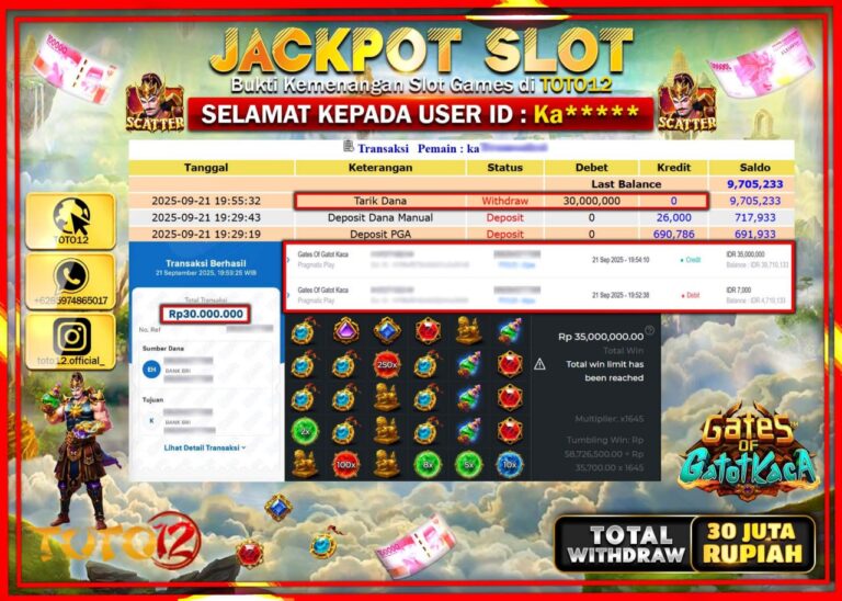 Selamat kepada Member Kami Ka****** Telah Jackpot dan berhasil mendapatkan kemenangan besar pada permainan JACKPOT SLOT GAME (GATES OF GATOT KACA) Dengan Kemenangan Sebesar Rp.30.000.000 –. Setelah mengisi Fomulir Withdraw dengan Kurang waktu 1-2 Menit Dana sudah kami Trasnfer kepada Pemilik Userid dan dana sudah dapat di cairkan oleh pemenang. Bukti Pembayaran yang TOTO12 berikan merupakan…