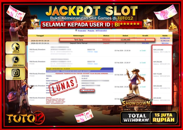 Selamat kepada Member Kami Bi****** Telah Jackpot dan berhasil mendapatkan kemenangan besar pada permainan JACKPOT SLOT GAME (WILD BOUNTY SHOWDOWN) Dengan Kemenangan Sebesar Rp.15.000.000–. Setelah mengisi Fomulir Withdraw dengan Kurang waktu 1-2 Menit Dana sudah kami Trasnfer kepada Pemilik Userid dan dana sudah dapat di cairkan oleh pemenang. Bukti Pembayaran yang TOTO12 berikan merupakan Bukti Pembayaran…