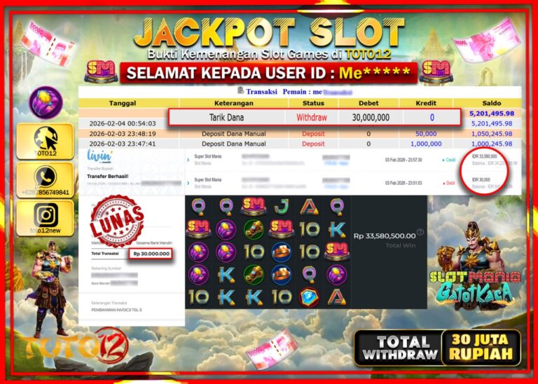 Selamat kepada Member Kami Me****** Telah Jackpot dan berhasil mendapatkan kemenangan besar pada permainan JACKPOT SLOT GAME (SLOT MANIA GATOT KACA) Dengan Kemenangan Sebesar Rp.30.000.000 –. Setelah mengisi Fomulir Withdraw dengan Kurang waktu 1-2 Menit Dana sudah kami Trasnfer kepada Pemilik Userid dan dana sudah dapat di cairkan oleh pemenang. Bukti Pembayaran yang TOTO12 berikan merupakan…