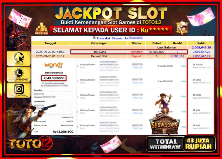 Selamat kepada Member Kami Ku****** Telah Jackpot dan berhasil mendapatkan kemenangan besar pada permainan JACKPOT SLOT GAME (WILD BOUNTY SHOWDOWN) Dengan Kemenangan Sebesar Rp.43.000.000 –. Setelah mengisi Fomulir Withdraw dengan Kurang waktu 1-2 Menit Dana sudah kami Trasnfer kepada Pemilik Userid dan dana sudah dapat di cairkan oleh pemenang. Bukti Pembayaran yang TOTO12 berikan merupakan Bukti…