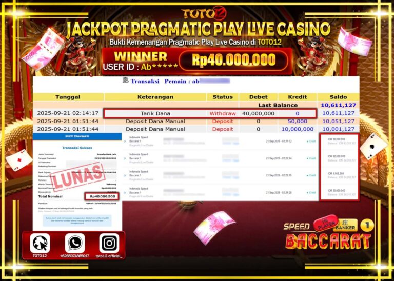 Selamat kepada Member Kami Ab****** Telah Jackpot dan berhasil mendapatkan kemenangan besar pada permainan JACKPOT PRAGMATIC PLAY LIVE CASINO (INDONESIA SPEED BACCARAT 1) Dengan Kemenangan Sebesar Rp.40.000.000 –. Setelah mengisi Fomulir Withdraw dengan Kurang waktu 1-2 Menit Dana sudah kami Trasnfer kepada Pemilik Userid dan dana sudah dapat di cairkan oleh pemenang. Bukti Pembayaran yang TOTO12…