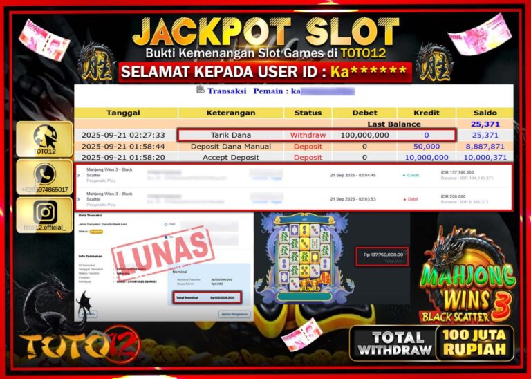 Selamat kepada Member Kami Ka****** Telah Jackpot dan berhasil mendapatkan kemenangan besar pada permainan JACKPOT SLOT GAME (MAHJONG WINS 3 BLACK SCATTER) Dengan Kemenangan Sebesar Rp.100.000.000 –. Setelah mengisi Fomulir Withdraw dengan Kurang waktu 1-2 Menit Dana sudah kami Trasnfer kepada Pemilik Userid dan dana sudah dapat di cairkan oleh pemenang. Bukti Pembayaran yang TOTO12 berikan…
