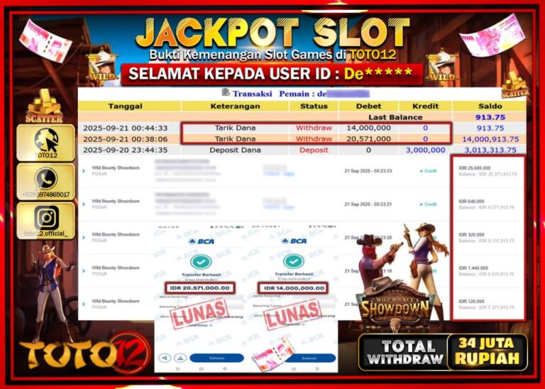 Selamat kepada Member Kami De****** Telah Jackpot dan berhasil mendapatkan kemenangan besar pada permainan JACKPOT SLOT GAME (WILD BOUNTY SHOWDOWN) Dengan Kemenangan Sebesar Rp.34.571.000 –. Setelah mengisi Fomulir Withdraw dengan Kurang waktu 1-2 Menit Dana sudah kami Trasnfer kepada Pemilik Userid dan dana sudah dapat di cairkan oleh pemenang. Bukti Pembayaran yang TOTO12 berikan merupakan Bukti…