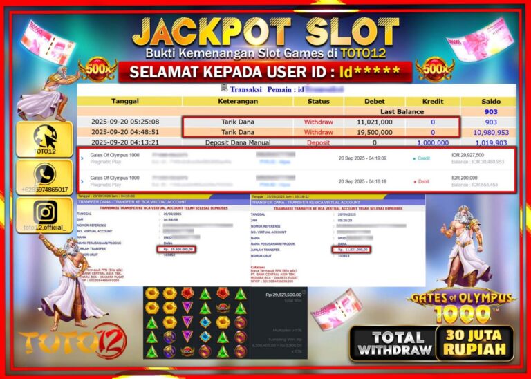 Selamat kepada Member Kami Id****** Telah Jackpot dan berhasil mendapatkan kemenangan besar pada permainan JACKPOT SLOT GAME (GATES OF OLYMPUS 1000) Dengan Kemenangan Sebesar Rp.30.521.000 –. Setelah mengisi Fomulir Withdraw dengan Kurang waktu 1-2 Menit Dana sudah kami Trasnfer kepada Pemilik Userid dan dana sudah dapat di cairkan oleh pemenang. Bukti Pembayaran yang TOTO12 berikan merupakan…