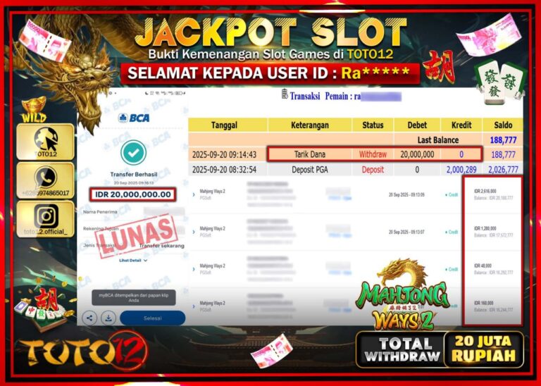 Selamat kepada Member Kami Ra****** Telah Jackpot dan berhasil mendapatkan kemenangan besar pada permainan JACKPOT SLOT GAME (MAHJONG WAYS 2) Dengan Kemenangan Sebesar Rp.20.000.000 –. Setelah mengisi Fomulir Withdraw dengan Kurang waktu 1-2 Menit Dana sudah kami Trasnfer kepada Pemilik Userid dan dana sudah dapat di cairkan oleh pemenang. Bukti Pembayaran yang TOTO12 berikan merupakan Bukti…