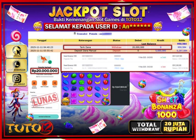 Selamat kepada Member Kami An****** Telah Jackpot dan berhasil mendapatkan kemenangan besar pada permainan JACKPOT SLOT GAME (SWEET BONANZA 1000) Dengan Kemenangan Sebesar Rp.20.000.000 –. Setelah mengisi Fomulir Withdraw dengan Kurang waktu 1-2 Menit Dana sudah kami Trasnfer kepada Pemilik Userid dan dana sudah dapat di cairkan oleh pemenang. Bukti Pembayaran yang TOTO12 berikan merupakan Bukti…
