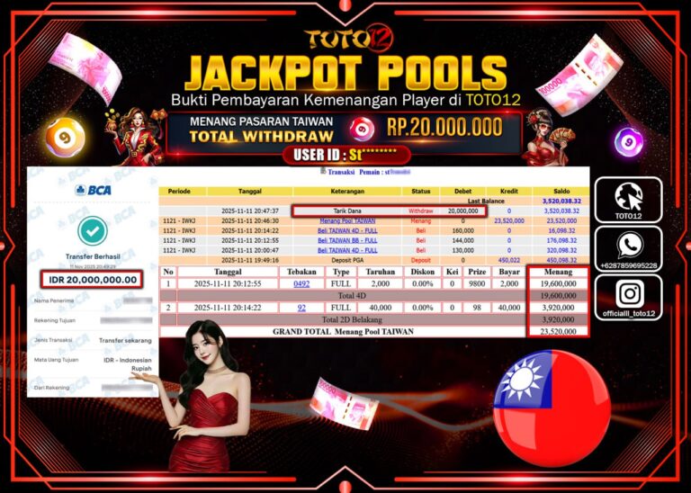 Selamat kepada Member Kami St****** Telah Jackpot dan berhasil mendapatkan kemenangan besar pada permainan JACKPOT POOLS PASARAN (TAIWAN) Dengan Kemenangan Sebesar Rp.20.000.000 –. Setelah mengisi Fomulir Withdraw dengan Kurang waktu 1-2 Menit Dana sudah kami Trasnfer kepada Pemilik Userid dan dana sudah dapat di cairkan oleh pemenang. Bukti Pembayaran yang TOTO12 berikan merupakan Bukti Pembayaran yang …