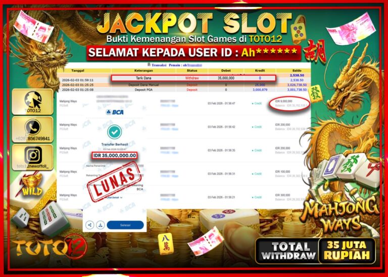 Selamat kepada Member Kami Ah****** Telah Jackpot dan berhasil mendapatkan kemenangan besar pada permainan JACKPOT SLOT GAME (MAHJONG WAYS) Dengan Kemenangan Sebesar Rp.35.000.000 –. Setelah mengisi Fomulir Withdraw dengan Kurang waktu 1-2 Menit Dana sudah kami Trasnfer kepada Pemilik Userid dan dana sudah dapat di cairkan oleh pemenang. Bukti Pembayaran yang TOTO12 berikan merupakan Bukti Pembayaran…