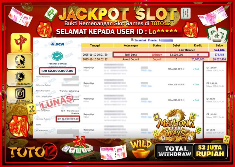 Selamat kepada Member Kami Lo****** Telah Jackpot dan berhasil mendapatkan kemenangan besar pada permainan JACKPOT SLOT GAME (MAHJONG WAYS) Dengan Kemenangan Sebesar Rp.52.000.000 –. Setelah mengisi Fomulir Withdraw dengan Kurang waktu 1-2 Menit Dana sudah kami Trasnfer kepada Pemilik Userid dan dana sudah dapat di cairkan oleh pemenang. Bukti Pembayaran yang TOTO12 berikan merupakan Bukti Pembayaran…