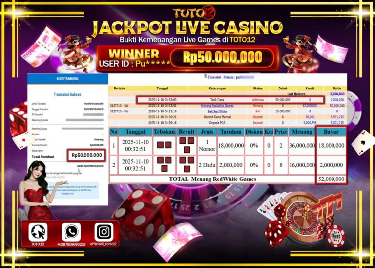 Selamat kepada Member Kami Ek****** Telah Jackpot dan berhasil mendapatkan kemenangan besar pada permainan JACKPOT LIVE CASINO (REDWHITE GAMES) Dengan Kemenangan Sebesar Rp.60.000.000 –. Setelah mengisi Fomulir Withdraw dengan Kurang waktu 1-2 Menit Dana sudah kami Trasnfer kepada Pemilik Userid dan dana sudah dapat di cairkan oleh pemenang. Bukti Pembayaran yang TOTO12 berikan merupakan Bukti Pembayaran…