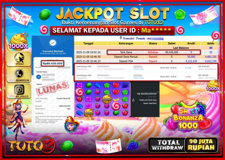 Selamat kepada Member Kami Ma****** Telah Jackpot dan berhasil mendapatkan kemenangan besar pada permainan JACKPOT SLOT GAME (SWEET BONANZA 1000) Dengan Kemenangan Sebesar Rp.90.430.000 –. Setelah mengisi Fomulir Withdraw dengan Kurang waktu 1-2 Menit Dana sudah kami Trasnfer kepada Pemilik Userid dan dana sudah dapat di cairkan oleh pemenang. Bukti Pembayaran yang TOTO12 berikan merupakan Bukti…