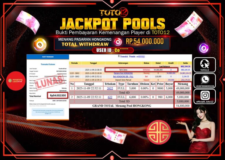 Selamat kepada Member Kami Ek****** Telah Jackpot dan berhasil mendapatkan kemenangan besar pada permainan JACKPOT POOLS PASARAN (HONGKONG) Dengan Kemenangan Sebesar Rp.95.000.000 –. Setelah mengisi Fomulir Withdraw dengan Kurang waktu 1-2 Menit Dana sudah kami Trasnfer kepada Pemilik Userid dan dana sudah dapat di cairkan oleh pemenang. Bukti Pembayaran yang TOTO12 berikan merupakan Bukti Pembayaran yang …