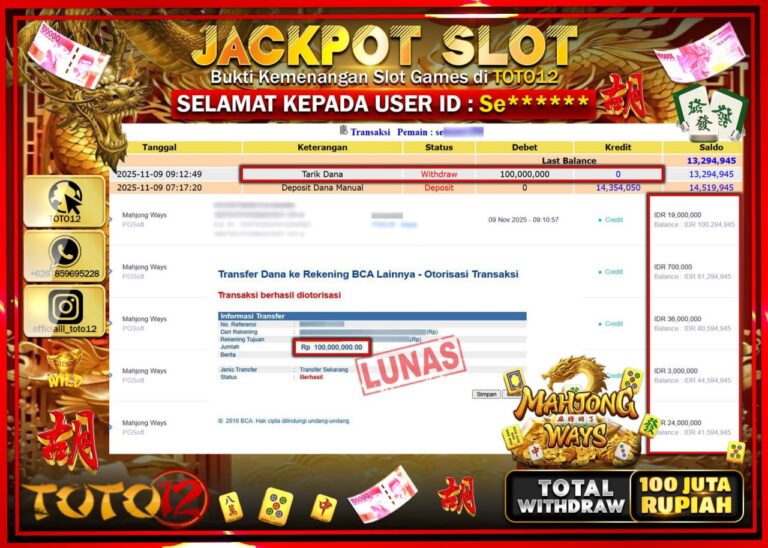 Selamat kepada Member Kami Se****** Telah Jackpot dan berhasil mendapatkan kemenangan besar pada permainan JACKPOT SLOT GAME (MAHJONG WAYS) Dengan Kemenangan Sebesar Rp.100.000.000 –. Setelah mengisi Fomulir Withdraw dengan Kurang waktu 1-2 Menit Dana sudah kami Trasnfer kepada Pemilik Userid dan dana sudah dapat di cairkan oleh pemenang. Bukti Pembayaran yang TOTO12 berikan merupakan Bukti Pembayaran…