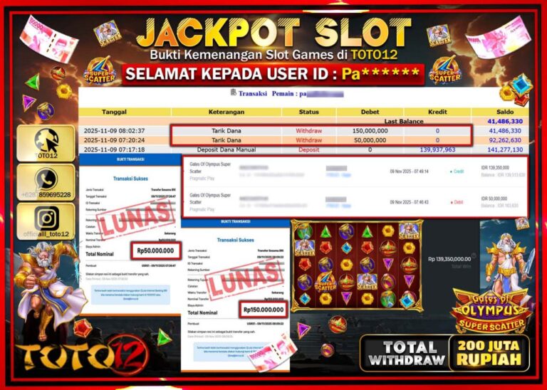 Selamat kepada Member Kami Pa****** Telah Jackpot dan berhasil mendapatkan kemenangan besar pada permainan JACKPOT SLOT GAME (GATES OF OLYMPUS SUPER SCATTER) Dengan Kemenangan Sebesar Rp.200.000.000 –. Setelah mengisi Fomulir Withdraw dengan Kurang waktu 1-2 Menit Dana sudah kami Trasnfer kepada Pemilik Userid dan dana sudah dapat di cairkan oleh pemenang. Bukti Pembayaran yang TOTO12 berikan…