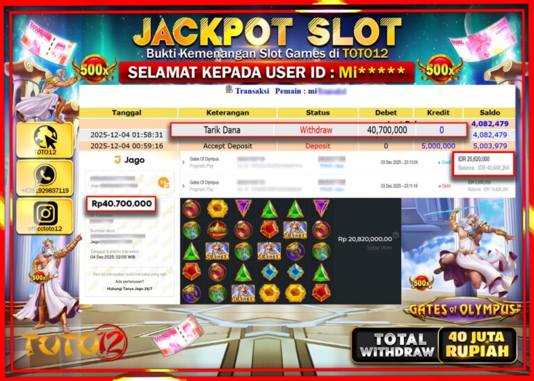 Selamat kepada Member Kami Mi****** Telah Jackpot dan berhasil mendapatkan kemenangan besar pada permainan JACKPOT SLOT GAME (GATES OF OLYMPUS) Dengan Kemenangan Sebesar Rp.40.700.000 –. Setelah mengisi Fomulir Withdraw dengan Kurang waktu 1-2 Menit Dana sudah kami Trasnfer kepada Pemilik Userid dan dana sudah dapat di cairkan oleh pemenang. Bukti Pembayaran yang TOTO12 berikan merupakan Bukti…