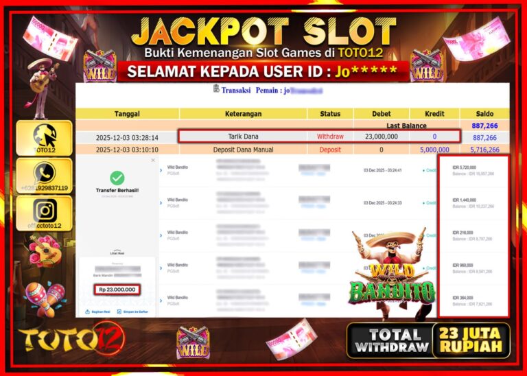 Selamat kepada Member Kami Jo****** Telah Jackpot dan berhasil mendapatkan kemenangan besar pada permainan JACKPOT SLOT GAME (WILD BANDITO) Dengan Kemenangan Sebesar Rp.23.000.000 –. Setelah mengisi Fomulir Withdraw dengan Kurang waktu 1-2 Menit Dana sudah kami Trasnfer kepada Pemilik Userid dan dana sudah dapat di cairkan oleh pemenang. Bukti Pembayaran yang TOTO12 berikan merupakan Bukti Pembayaran…