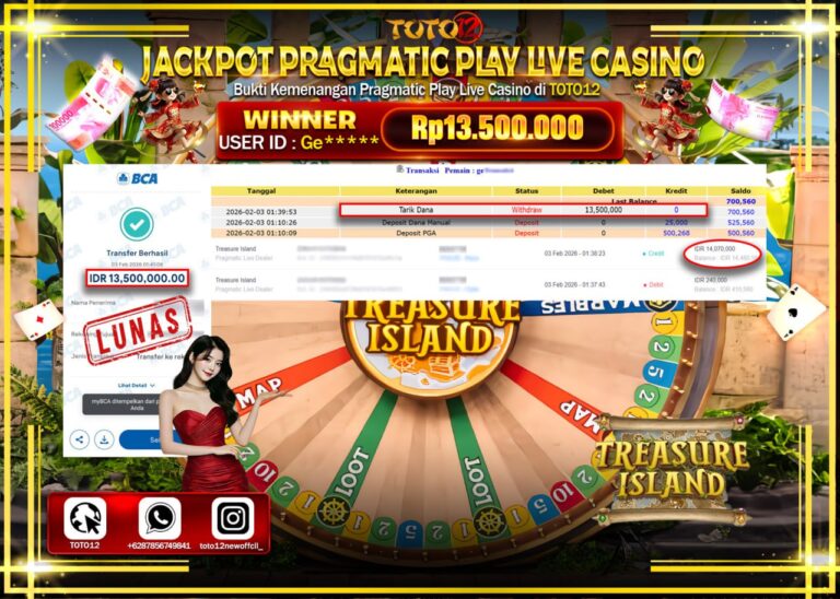 HANYA DI TOTO12 JP PASTI DI BAYAR LUNAS DAN CEPAT!!!!!! JACKPOT PRAGMATIC PLAY LIVE CASINO (TREASURE ISLAND) Rp.13.500.000 !!!!