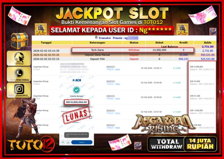 Selamat kepada Member Kami Ng****** Telah Jackpot dan berhasil mendapatkan kemenangan besar pada permainan JACKPOT SLOT GAME (ASGARDIAN RISING) Dengan Kemenangan Sebesar Rp.14.500.000–. Setelah mengisi Fomulir Withdraw dengan Kurang waktu 1-2 Menit Dana sudah kami Trasnfer kepada Pemilik Userid dan dana sudah dapat di cairkan oleh pemenang. Bukti Pembayaran yang TOTO12 berikan merupakan Bukti Pembayaran yang SAH…