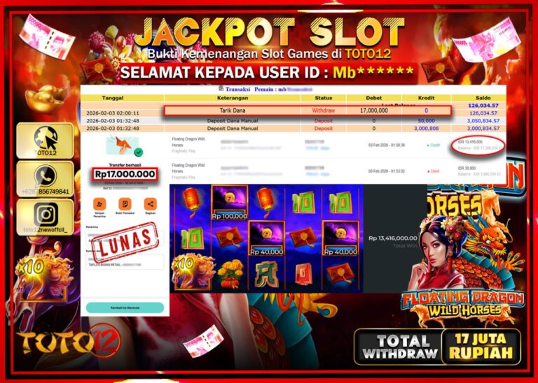 Selamat kepada Member Kami Mb****** Telah Jackpot dan berhasil mendapatkan kemenangan besar pada permainan JACKPOT SLOT GAME (FLOATING DRAGON WILD HORSES) Dengan Kemenangan Sebesar Rp.17.000.000–. Setelah mengisi Fomulir Withdraw dengan Kurang waktu 1-2 Menit Dana sudah kami Trasnfer kepada Pemilik Userid dan dana sudah dapat di cairkan oleh pemenang. Bukti Pembayaran yang TOTO12 berikan merupakan Bukti…