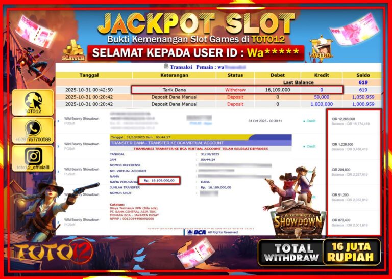 Selamat kepada Member Kami Wa****** Telah Jackpot dan berhasil mendapatkan kemenangan besar pada permainan JACKPOT SLOT GAME (WILD BOUNTY SHOWDOWN) Dengan Kemenangan Sebesar Rp.16.109.000 –. Setelah mengisi Fomulir Withdraw dengan Kurang waktu 1-2 Menit Dana sudah kami Trasnfer kepada Pemilik Userid dan dana sudah dapat di cairkan oleh pemenang. Bukti Pembayaran yang TOTO12 berikan merupakan Bukti…