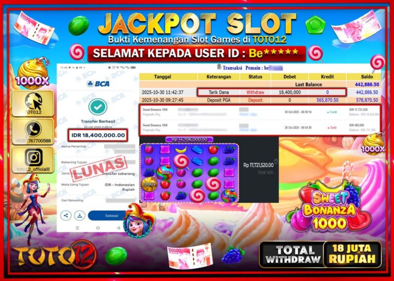 Selamat kepada Member Kami Be****** Telah Jackpot dan berhasil mendapatkan kemenangan besar pada permainan JACKPOT SLOT GAME (SWEET BONANZA 1000) Dengan Kemenangan Sebesar Rp.18.400.000 –. Setelah mengisi Fomulir Withdraw dengan Kurang waktu 1-2 Menit Dana sudah kami Trasnfer kepada Pemilik Userid dan dana sudah dapat di cairkan oleh pemenang. Bukti Pembayaran yang TOTO12 berikan merupakan Bukti…