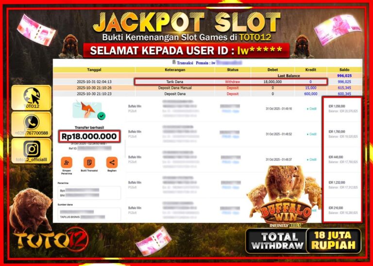 Selamat kepada Member Kami Iw****** Telah Jackpot dan berhasil mendapatkan kemenangan besar pada permainan JACKPOT SLOT GAME (BUFFALO WIN) Dengan Kemenangan Sebesar Rp.18.000.000 –. Setelah mengisi Fomulir Withdraw dengan Kurang waktu 1-2 Menit Dana sudah kami Trasnfer kepada Pemilik Userid dan dana sudah dapat di cairkan oleh pemenang. Bukti Pembayaran yang TOTO12 berikan merupakan Bukti Pembayaran…