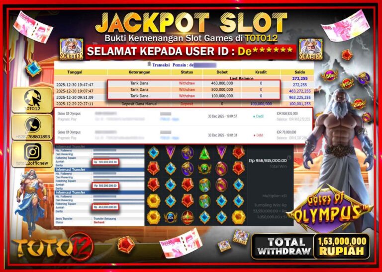 Selamat kepada Member Kami De****** Telah Jackpot dan berhasil mendapatkan kemenangan besar pada permainan JACKPOT SLOT GAME (GATES OF OLYMPUS) Dengan Kemenangan Sebesar Rp.1.63.000.000 –. Setelah mengisi Fomulir Withdraw dengan Kurang waktu 1-2 Menit Dana sudah kami Trasnfer kepada Pemilik Userid dan dana sudah dapat di cairkan oleh pemenang. Bukti Pembayaran yang TOTO12 berikan merupakan Bukti…