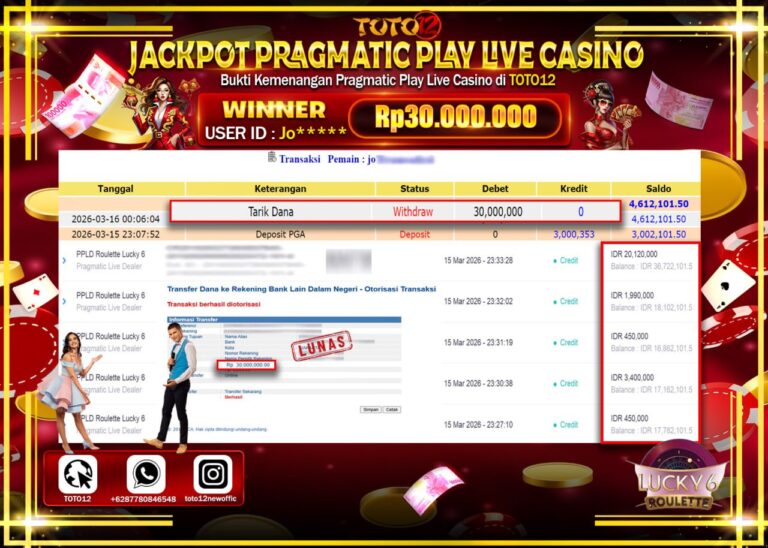 Selamat kepada Member Kami Jo****** Telah Jackpot dan berhasil mendapatkan kemenangan besar pada permainan JACKPOT PRAGMATIC PLAY LIVE GAME CASINO (PPLD ROULETTE LUCKY 6) Dengan Kemenangan Sebesar Rp.30.000.000–. Setelah mengisi Fomulir Withdraw dengan Kurang waktu 1-2 Menit Dana sudah kami Trasnfer kepada Pemilik Userid dan dana sudah dapat di cairkan oleh pemenang. Bukti Pembayaran yang TOTO12…