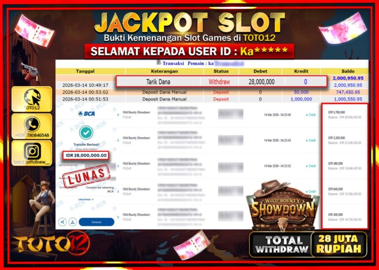 Selamat kepada Member Kami Ka****** Telah Jackpot dan berhasil mendapatkan kemenangan besar pada permainan JACKPOT SLOT GAME (WILD BOUNTY SHOWDOWN) Dengan Kemenangan Sebesar Rp.28.000.000. Setelah mengisi Fomulir Withdraw dengan Kurang waktu 1-2 Menit Dana sudah kami Trasnfer kepada Pemilik Userid dan dana sudah dapat di cairkan oleh pemenang. Bukti Pembayaran yang TOTO12 berikan merupakan Bukti Pembayaran…
