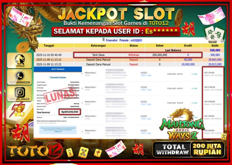 Selamat kepada Member Kami Es****** Telah Jackpot dan berhasil mendapatkan kemenangan besar pada permainan JACKPOT SLOT GAME (MAHJONG WAYS 2) Dengan Kemenangan Sebesar Rp.200.000.000 –. Setelah mengisi Fomulir Withdraw dengan Kurang waktu 1-2 Menit Dana sudah kami Trasnfer kepada Pemilik Userid dan dana sudah dapat di cairkan oleh pemenang. Bukti Pembayaran yang TOTO12 berikan merupakan Bukti…