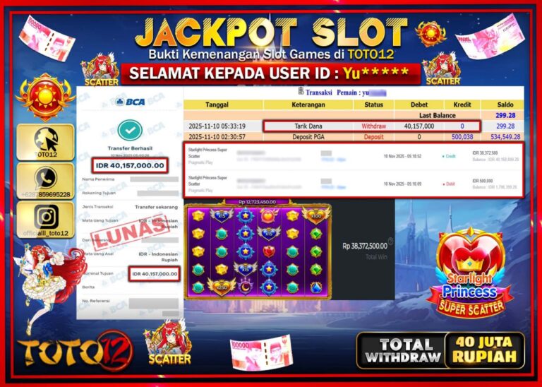 Selamat kepada Member Kami Yu****** Telah Jackpot dan berhasil mendapatkan kemenangan besar pada permainan JACKPOT SLOT GAME (STARLIGHT PRINCESS SUPER SCATTER) Dengan Kemenangan Sebesar Rp.40.157.000 –. Setelah mengisi Fomulir Withdraw dengan Kurang waktu 1-2 Menit Dana sudah kami Trasnfer kepada Pemilik Userid dan dana sudah dapat di cairkan oleh pemenang. Bukti Pembayaran yang TOTO12 berikan merupakan…