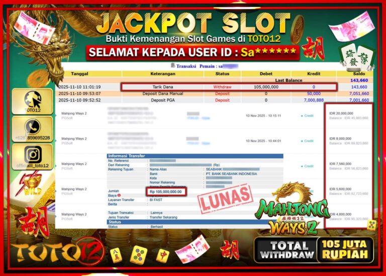 Selamat kepada Member Kami Sa****** Telah Jackpot dan berhasil mendapatkan kemenangan besar pada permainan JACKPOT SLOT GAME (MAHJONG WAYS 2) Dengan Kemenangan Sebesar Rp.105.000.000 –. Setelah mengisi Fomulir Withdraw dengan Kurang waktu 1-2 Menit Dana sudah kami Trasnfer kepada Pemilik Userid dan dana sudah dapat di cairkan oleh pemenang. Bukti Pembayaran yang TOTO12 berikan merupakan Bukti…