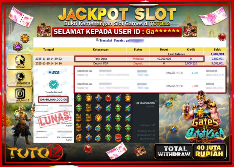 Selamat kepada Member Kami Ga****** Telah Jackpot dan berhasil mendapatkan kemenangan besar pada permainan JACKPOT SLOT GAME (GATES OF GATOT KACA) Dengan Kemenangan Sebesar Rp.40.000.000 –. Setelah mengisi Fomulir Withdraw dengan Kurang waktu 1-2 Menit Dana sudah kami Trasnfer kepada Pemilik Userid dan dana sudah dapat di cairkan oleh pemenang. Bukti Pembayaran yang TOTO12 berikan merupakan…