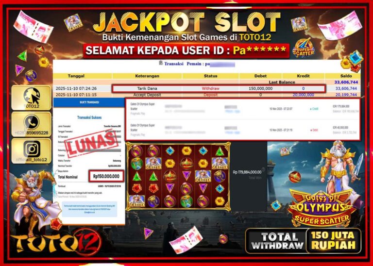 Selamat kepada Member Kami Pa****** Telah Jackpot dan berhasil mendapatkan kemenangan besar pada permainan JACKPOT SLOT GAME (GATES OF OLYMPUS SUPER SCATTER) Dengan Kemenangan Sebesar Rp.150.000.000 –. Setelah mengisi Fomulir Withdraw dengan Kurang waktu 1-2 Menit Dana sudah kami Trasnfer kepada Pemilik Userid dan dana sudah dapat di cairkan oleh pemenang. Bukti Pembayaran yang TOTO12 berikan…